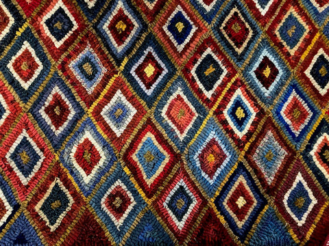 The next step in my color planning evolved as I started hooking the center diamonds. You may notice in my sample piece that the color pattern of the diamonds comes right to the edge. It almost looked like the rug was cut off rather than having a definite plan for the edge design. To my eye, the rug really needed some kind of a border, but I didn’t want to introduce a straight line around the edge so I decided on an ‘implied border’. The 1/2 diamond shapes were perfect for the implied border and alternating the solid red and blue colors added just the right touch.