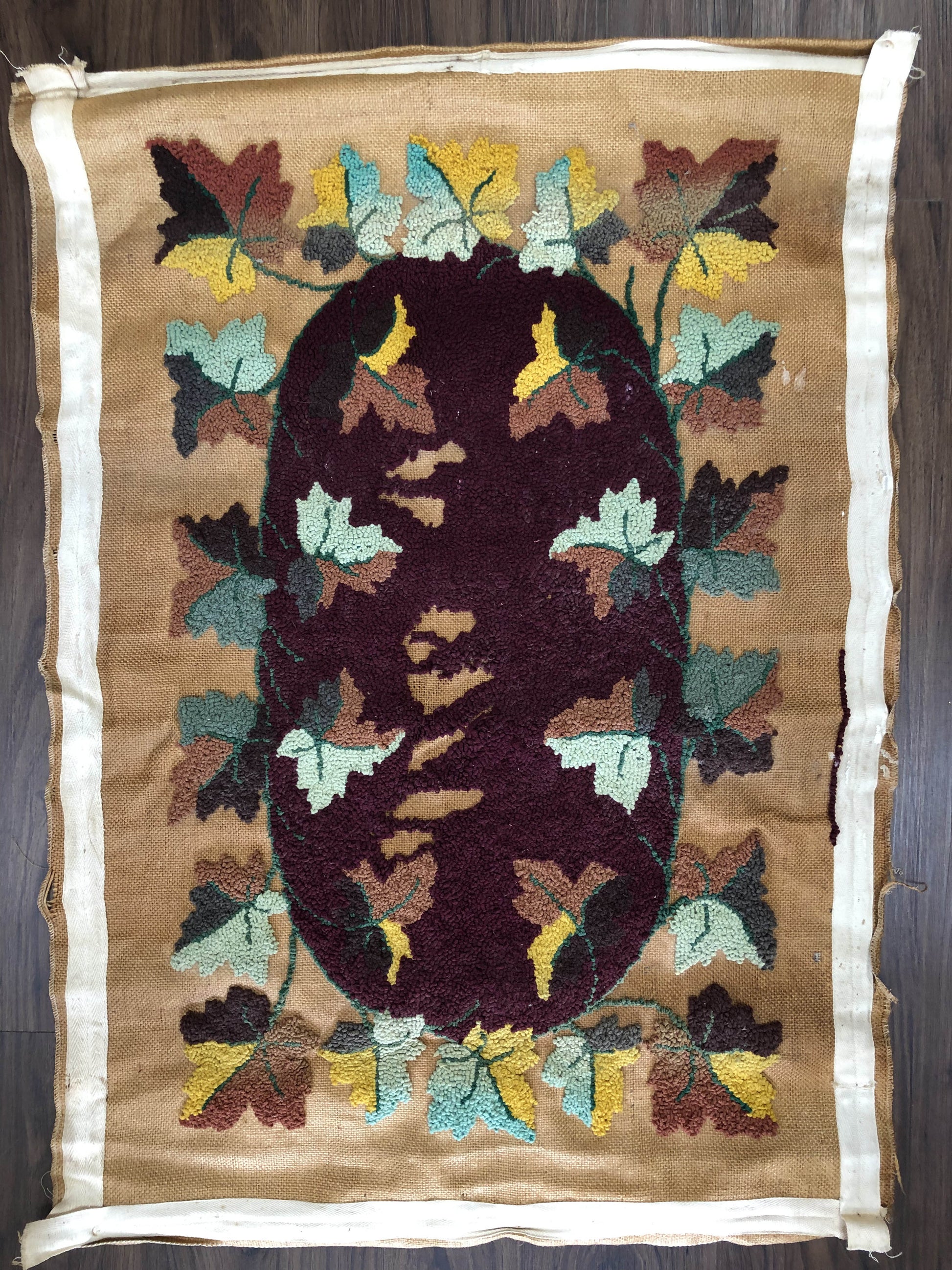 Leaves with maroon background. This fun autumn design is printed is hooked on good-condition burlap with a complete binding stitched on. No additional strips are included.
