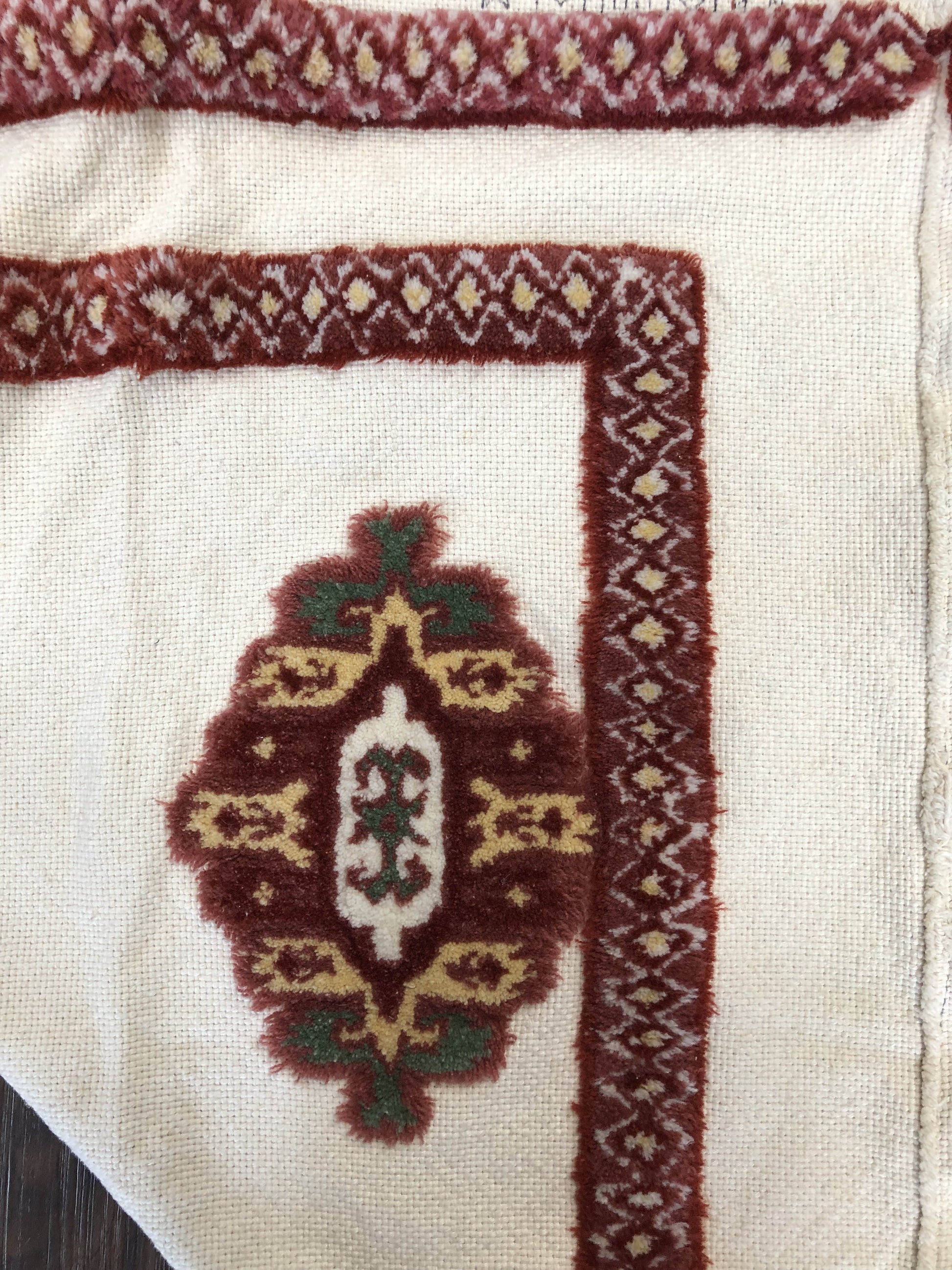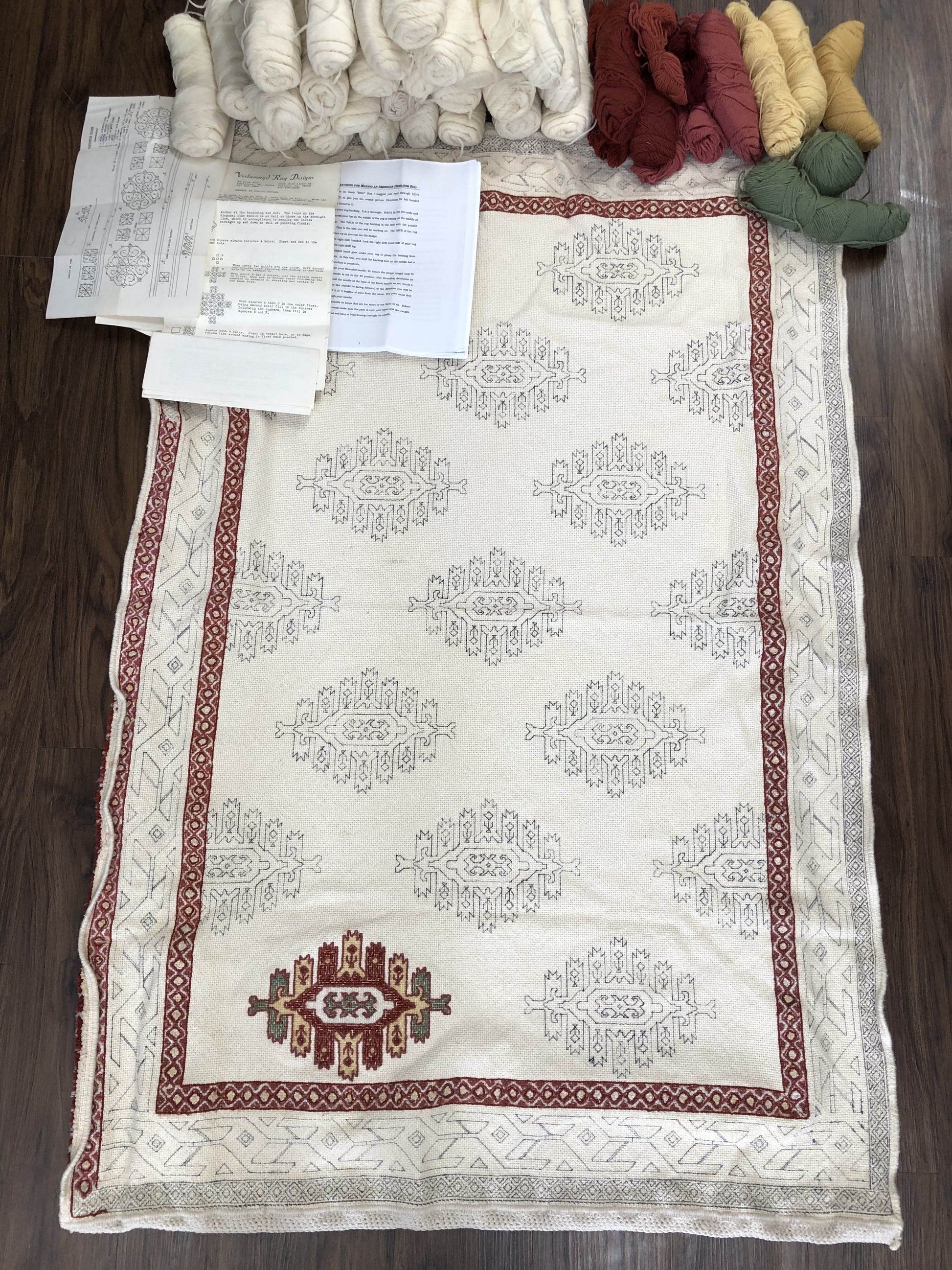 American heirloom rug with yarn. a Vetamayd Rug Design pattern printed comes with complete instructions as well as 27 skeins of cream-colored wool yarn for the background, and 9 skeins of additional colors. The piece includes a completed whipstitch binding.