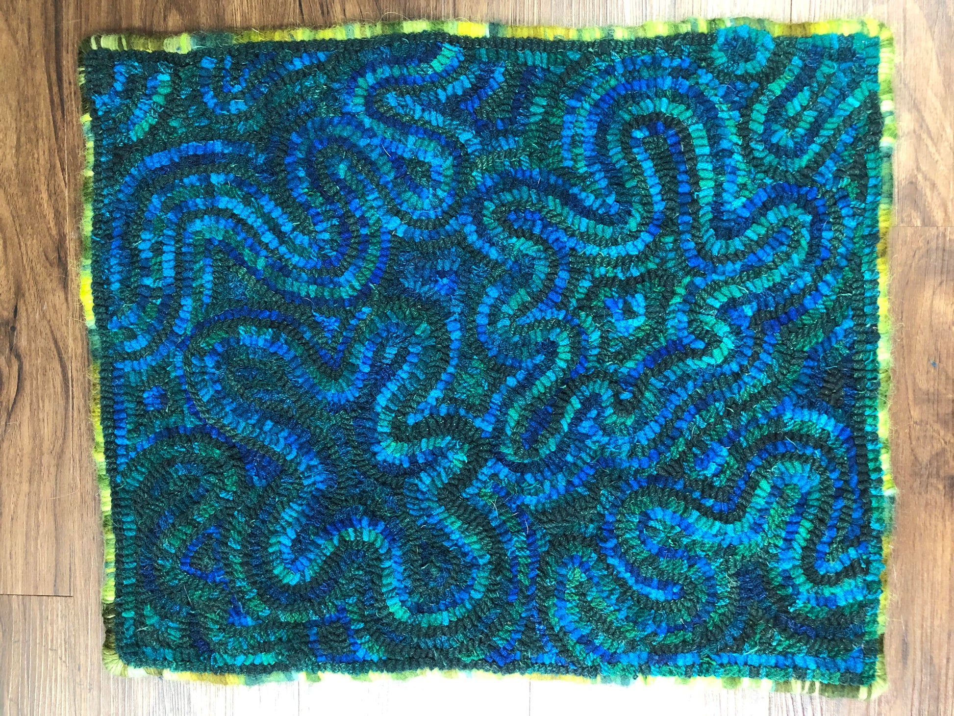 "Blue Turquoise Runner" by Mariah Krauss. A new hand-hooked rug using #8 hand-dyed wool strips on monks cloth foundation. Measures 16"x20".