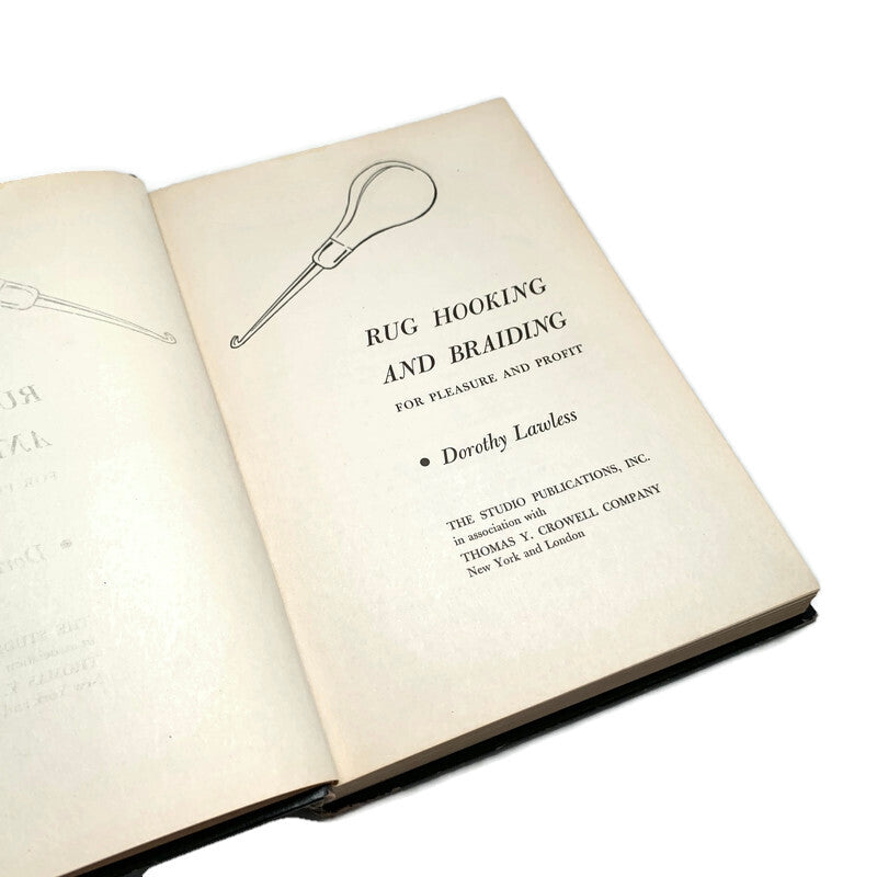 A vintage copy of "Rug Hooking and Braiding for Pleasure and Profit" by Dorothy Lawless, copyright 1952. Some wear to the cover.