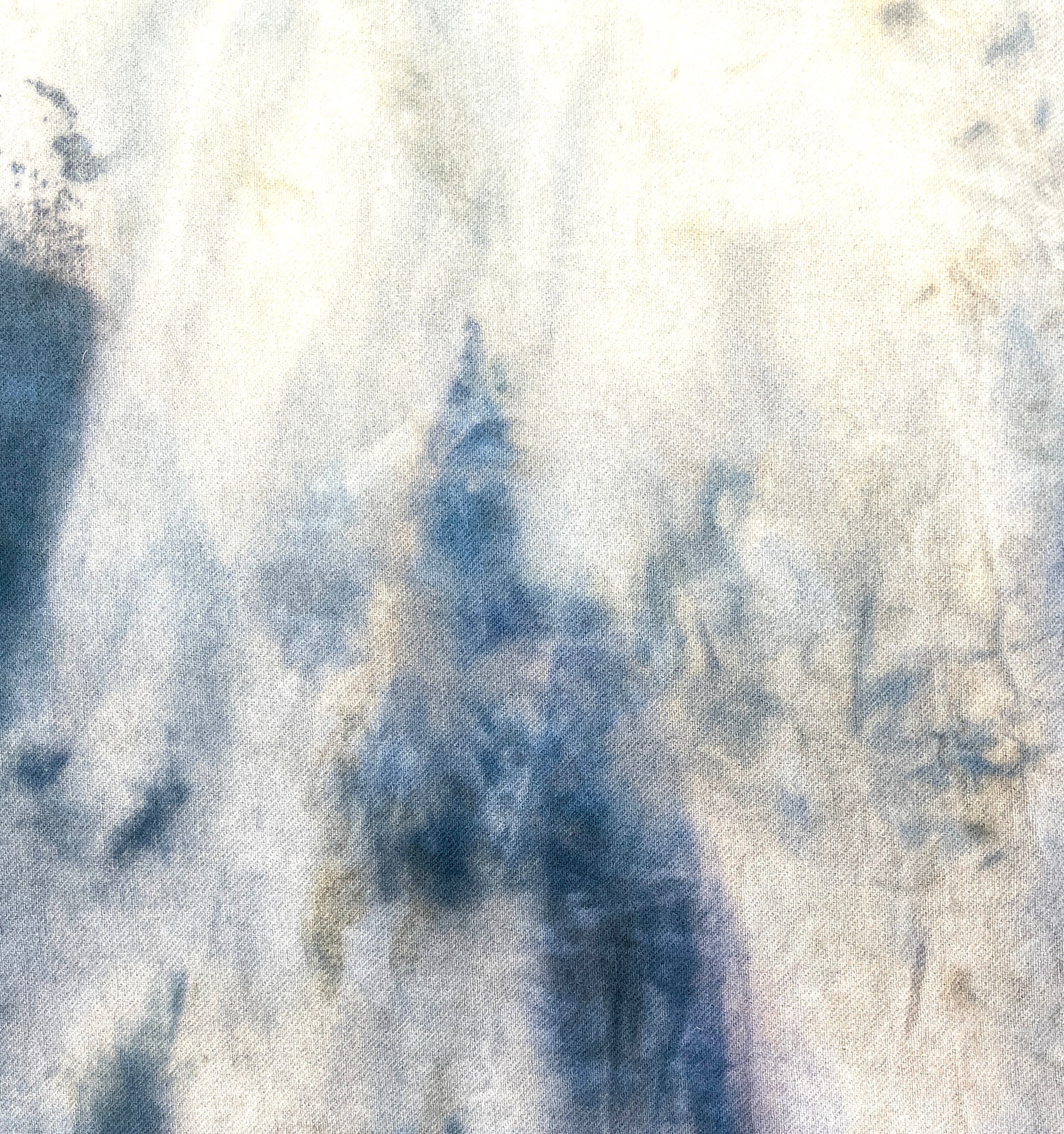 One of a kind, 100% hand dyed wool fabric. Available in 1/4 yard pieces. Shades of lighter blues to darker greyish-blues.