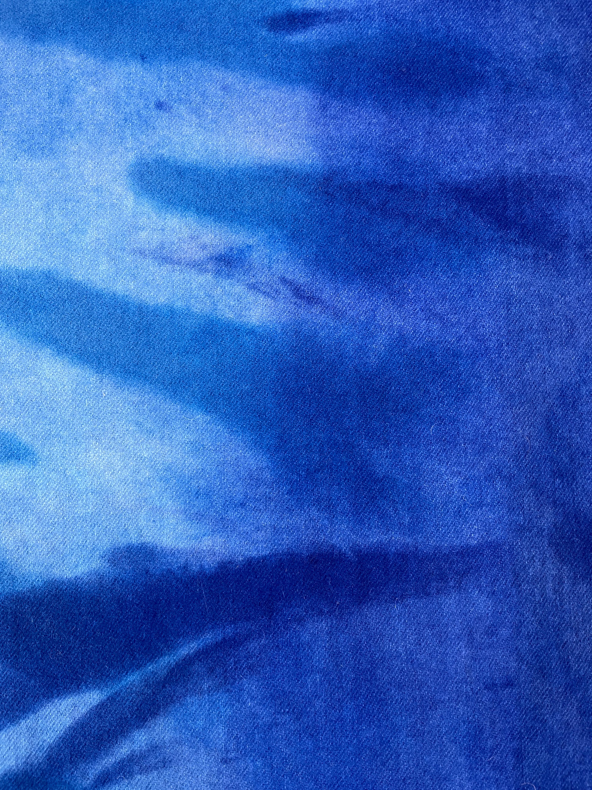 One of a kind, 100% hand dyed wool fabric; Spot dyed from light blues to bright blues. Available in 1/4 yard pieces.