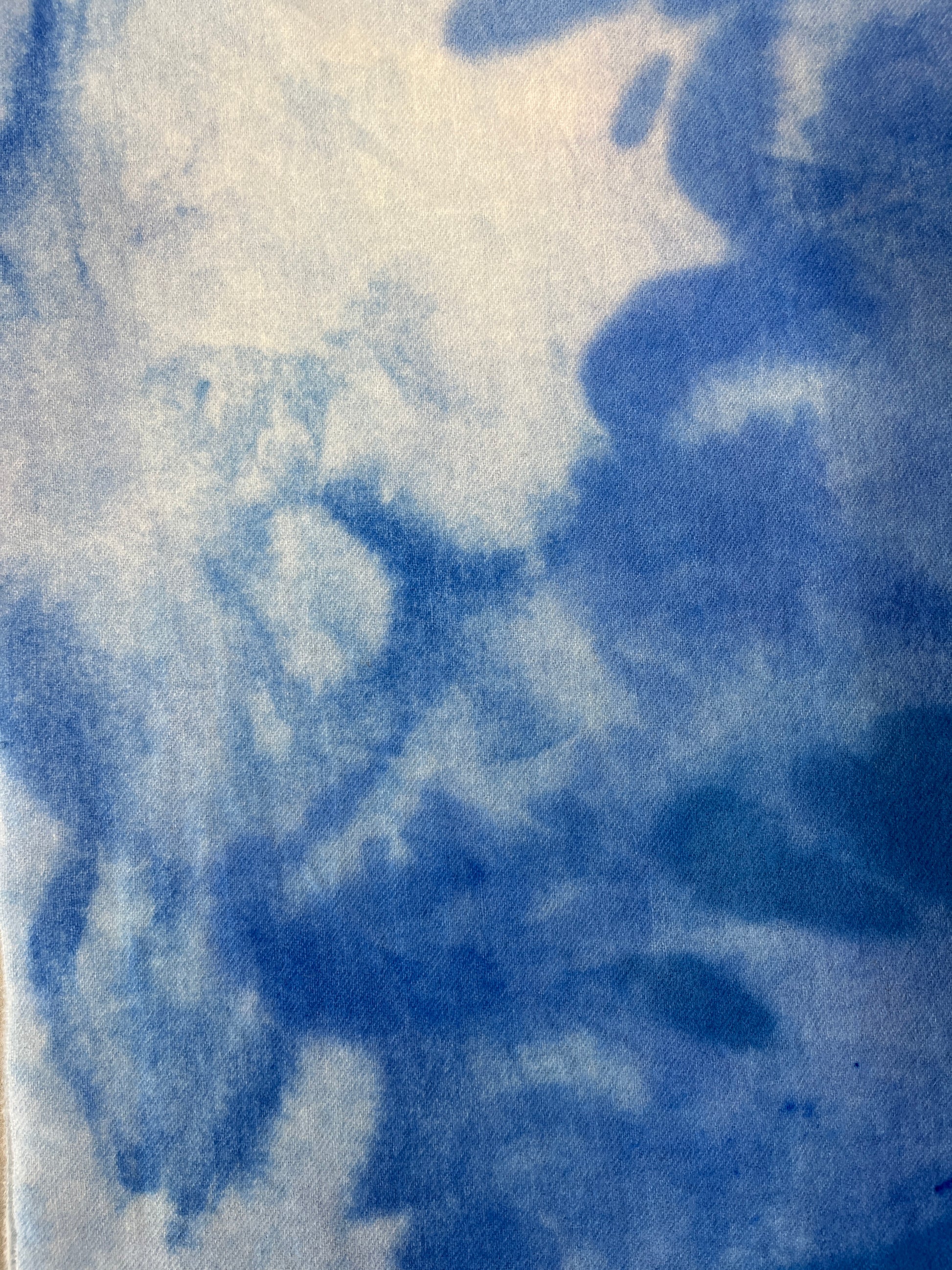 One of a kind, 100% hand dyed wool fabric; Spot dyed from soft light blues to soft darker blues. Available in 1/4 yard pieces.